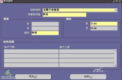 5、結轉範圍:系統只為輸入範圍內的賬戶以及分配給指定預算組織的賬戶結轉餘額。